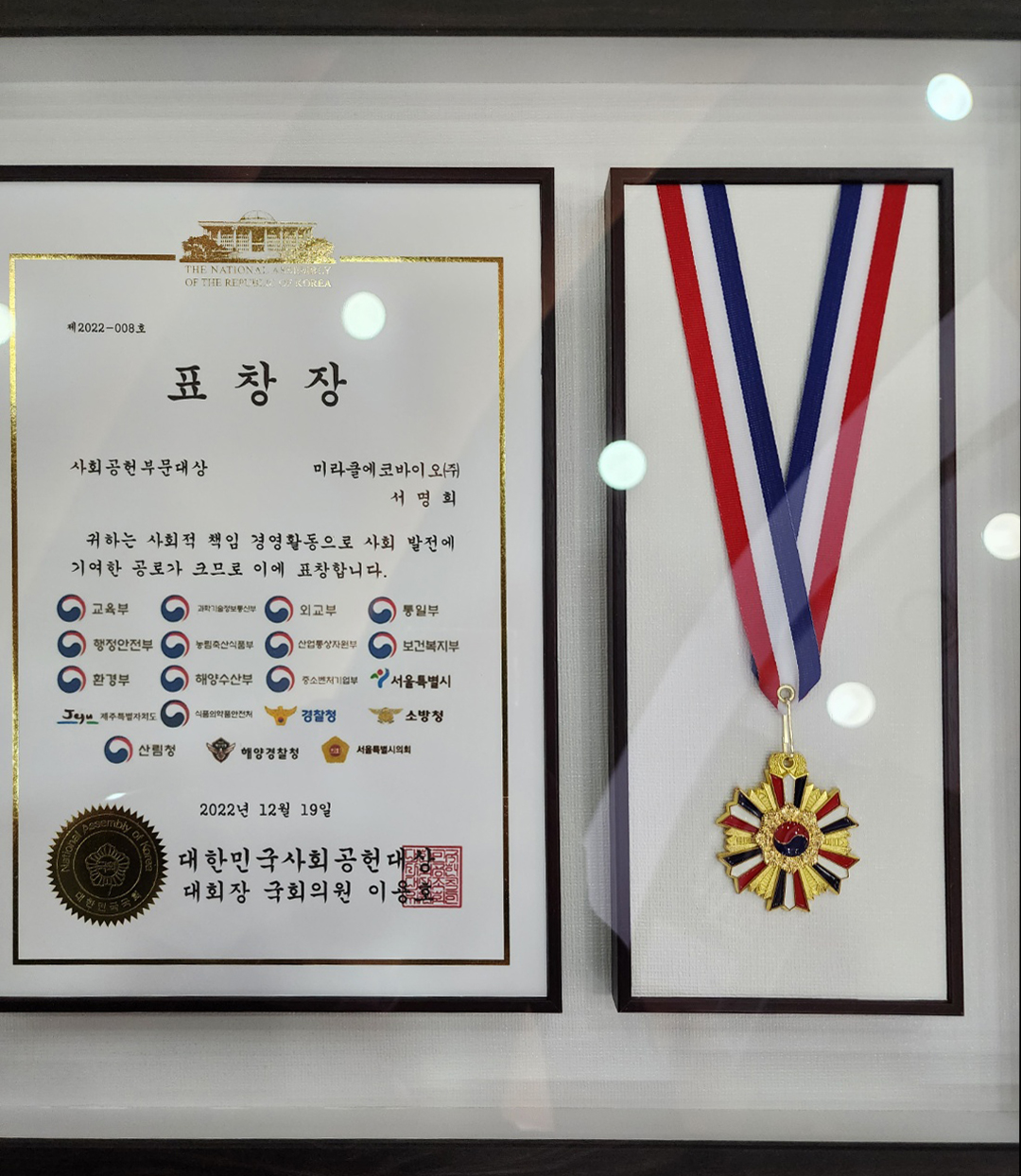 2022 제17회 대한민국사회공헌대상by greenp3in 뉴스센터on Posted on 2022년 12월 20일2023년 8월 21일 미라클에코바이오(주) 서명희 대표는 2022년 12월 19일자로 대한민국사회공헌 대상 시상식에서 표창장과 상장을 수상했습니다.