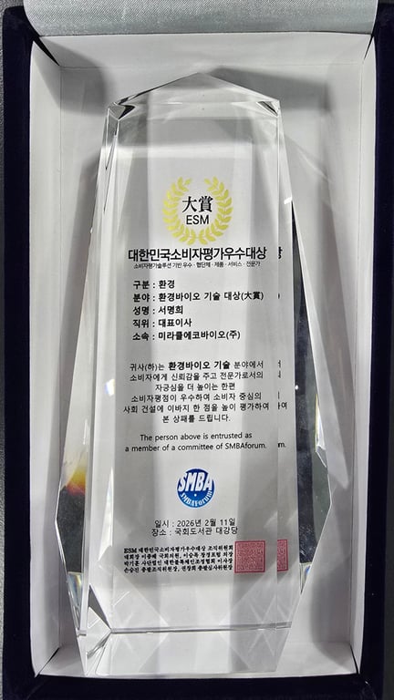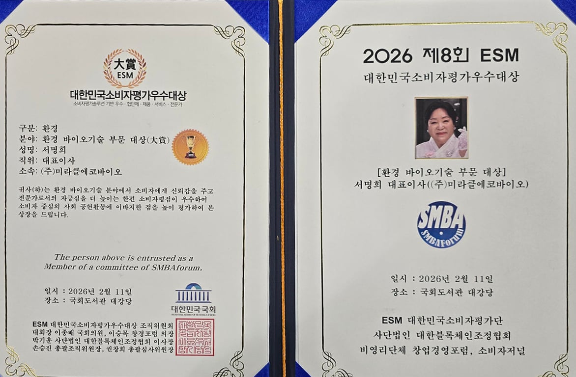 [강남구 소비자저널=김은정 대표기자] 미라클에코바이오(주) 서명희 대표이사는 2026년 2월 11일(수) 서울시 영등포구 소재 국회도서관 대강당에서 개최된 ‘2026 제8회 대한민국소비자평가 우수대상시상식’에서 환경 바이오 기술 부문 대상을 수상했다고 밝혔다.